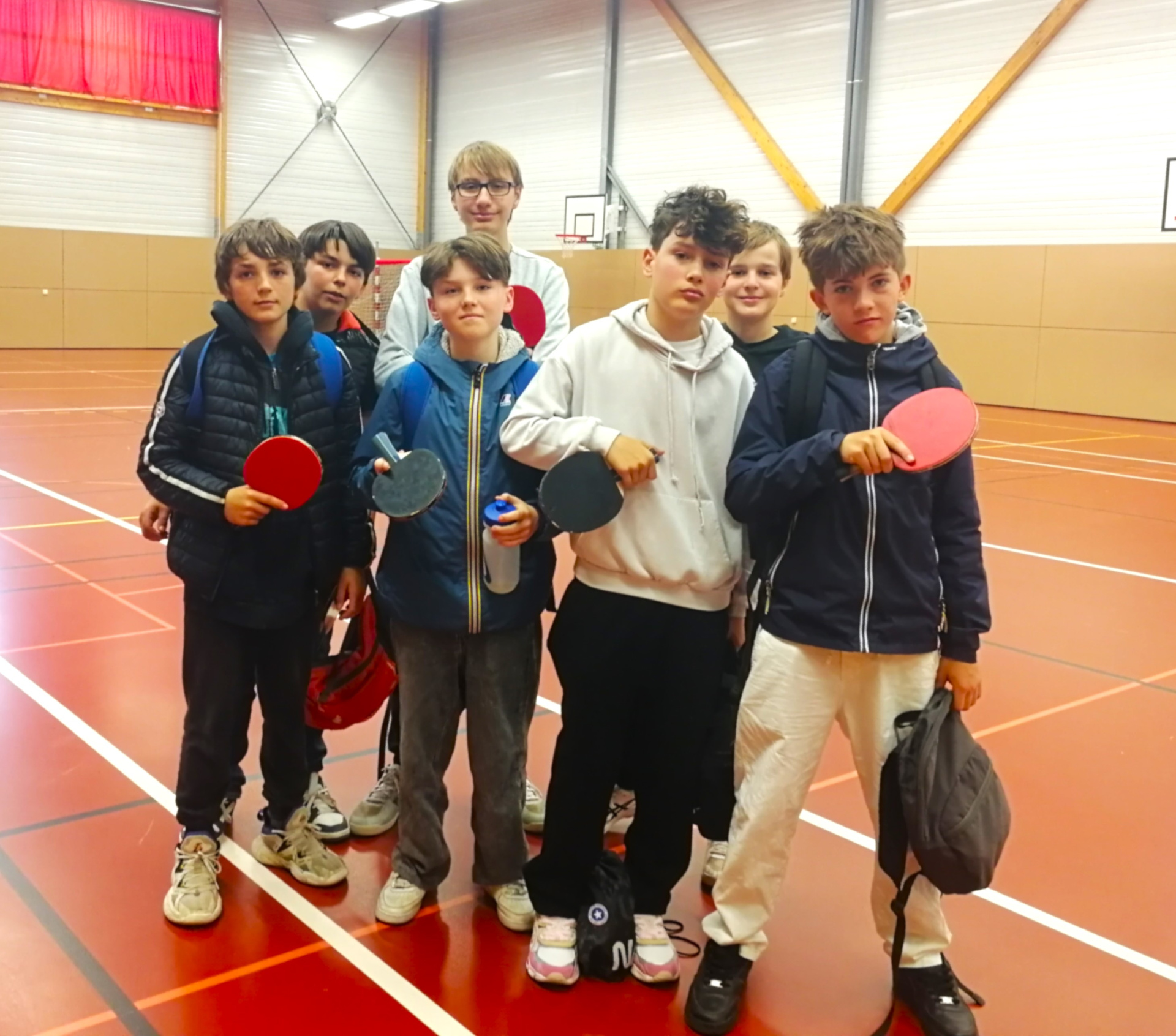 3 DUO ont représenté le collège Gilles Gahinet : Antoine et Quentin, Malo et Noam, Gabin et Elyjah. Alan, n’ayant pas de partenaire, a formé un DUO avec un élève du collège de Saint-Exupéry. Les rencontres se sont jouées en : 2 simples ( 1 simple /joueur) et un double sous forme de ronde italienne en 11- 21-33 pts (la 1re équipe à 33 points a gagné).